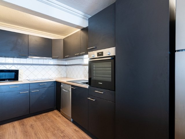 Отворената кухня е напълно оборудвана с керамични котлони, абсорбатор, фурна, микровълнова печка, хладилник, съдомиялна машина и кафемашина Nespresso, осигурявайки модерен комфорт за вашия престой.