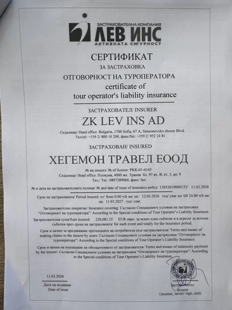 Хегемон Травел ЕООД притежава лиценз за извършване на туроператорска и турагентска дейност с номер на удостоверението № РКК-01-6145